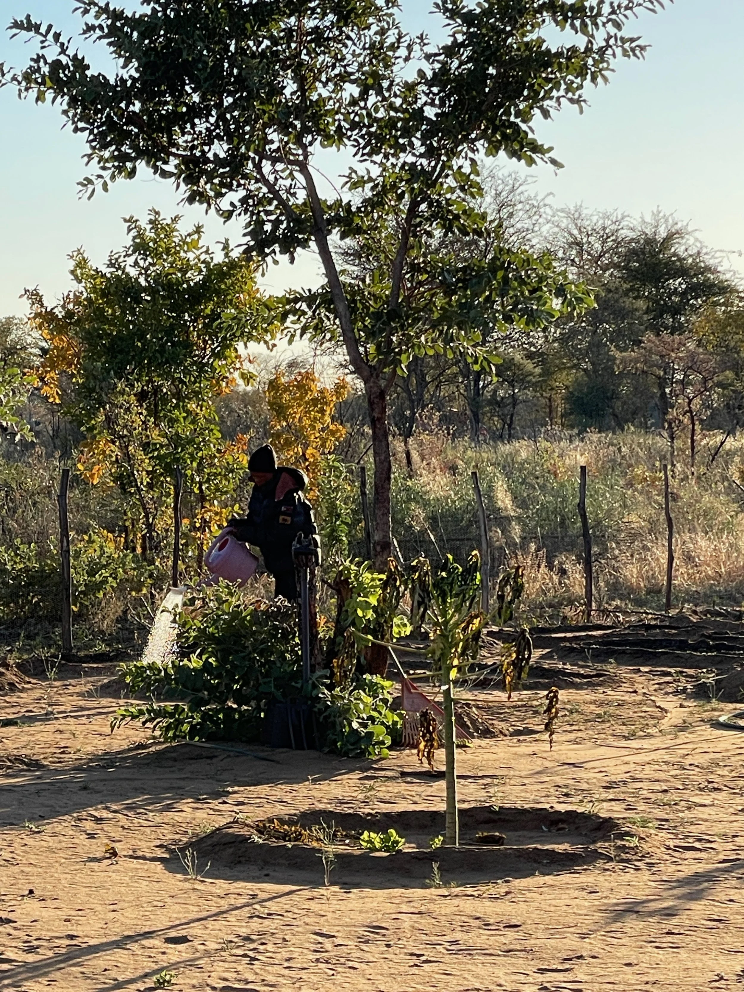 Daqm hand waters the plants to keep them alive until the rains come.