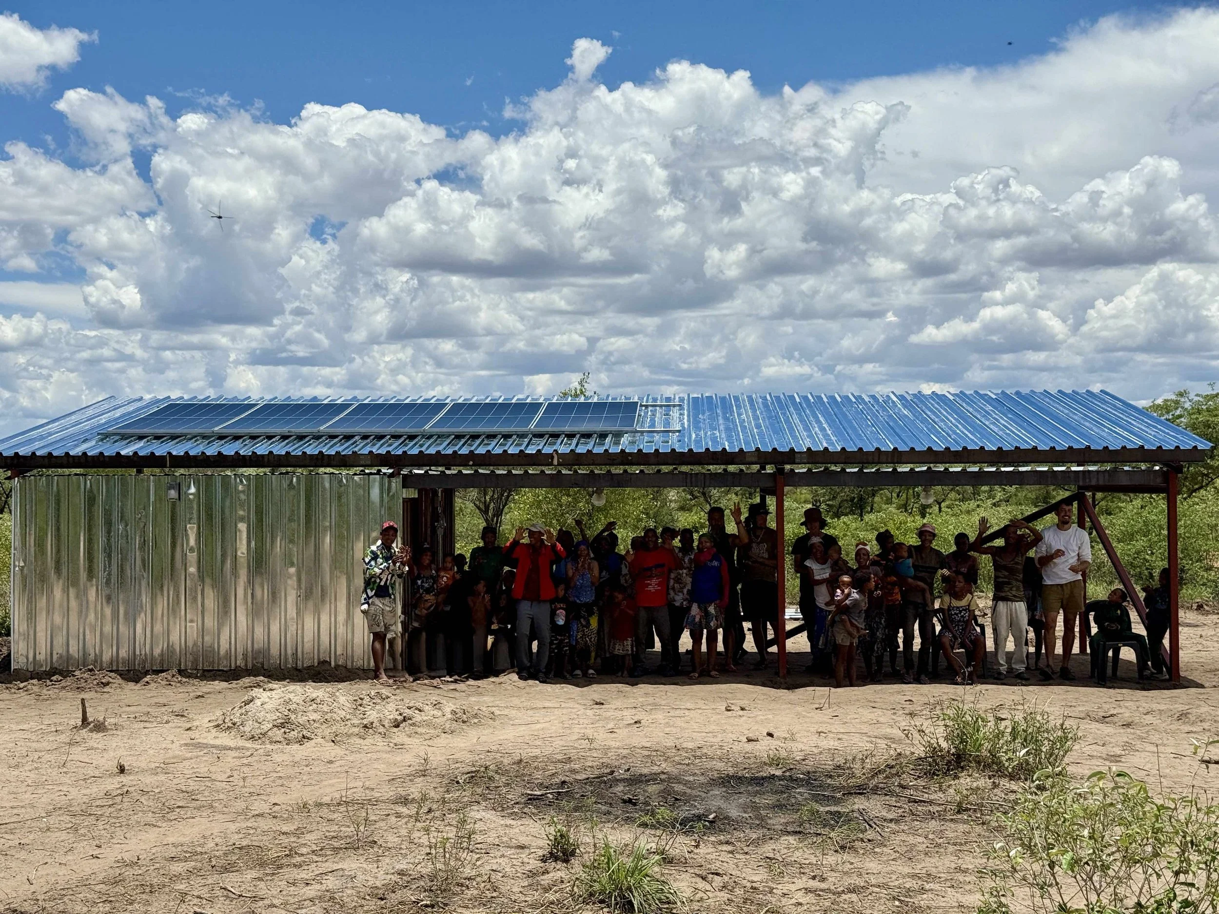 Solar power support: The structure now supports solar panels and a 3kW solar power system (see Solar Power Project). This has enabled the villagers to run a small freezer to store bush meat and avoid some of the hunger they currently experience. A locked storage room houses the solar inverter, batteries, etc. and Kxunta Daqm took a crash course in its maintenance.